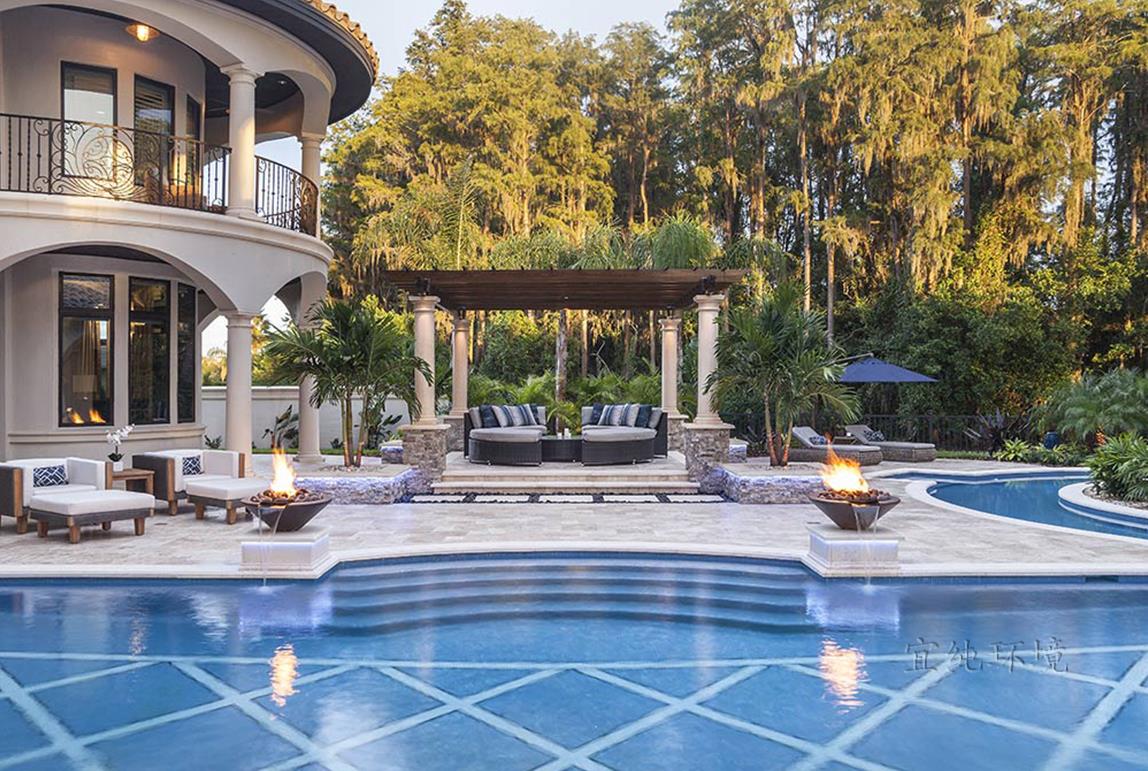 沿着泳池的边缘,一个个火碗变得奇妙,给泳池增添了别样的光彩。
